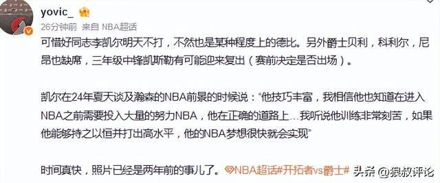 “yovic”原话说道:可惜好同志李凯尔明天不打,不然也是某种程度上的德比。另外爵士贝利,科利尔,尼昂也缺席,三年级中锋凯斯勒有可能迎来复出(赛前决定是否出场)。凯尔在24年夏天谈及瀚森的NBA前景的时候说:“他技巧丰富,我相信他也知道在进入NBA之前需要投入大量的努力NBA,他在正确的道路上,我听说他训练非常刻苦,如果他能够持之以恒并打出高水平,他的NBA梦想很快就会实现”。时间真快,照片已经是两年前的事儿了。