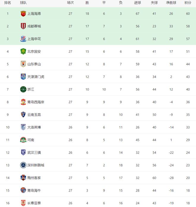 昨晚,争冠三强率先出战,上海海港客场4-3逆转青岛海牛,成都蓉城主场3-1击败梅州客家,上海申花客场2-1逆转青岛西海岸,这样积分榜前三还是相差3分,上海海港以2分优势力压成都蓉城,继续领跑积分榜,争冠悬念仍在。